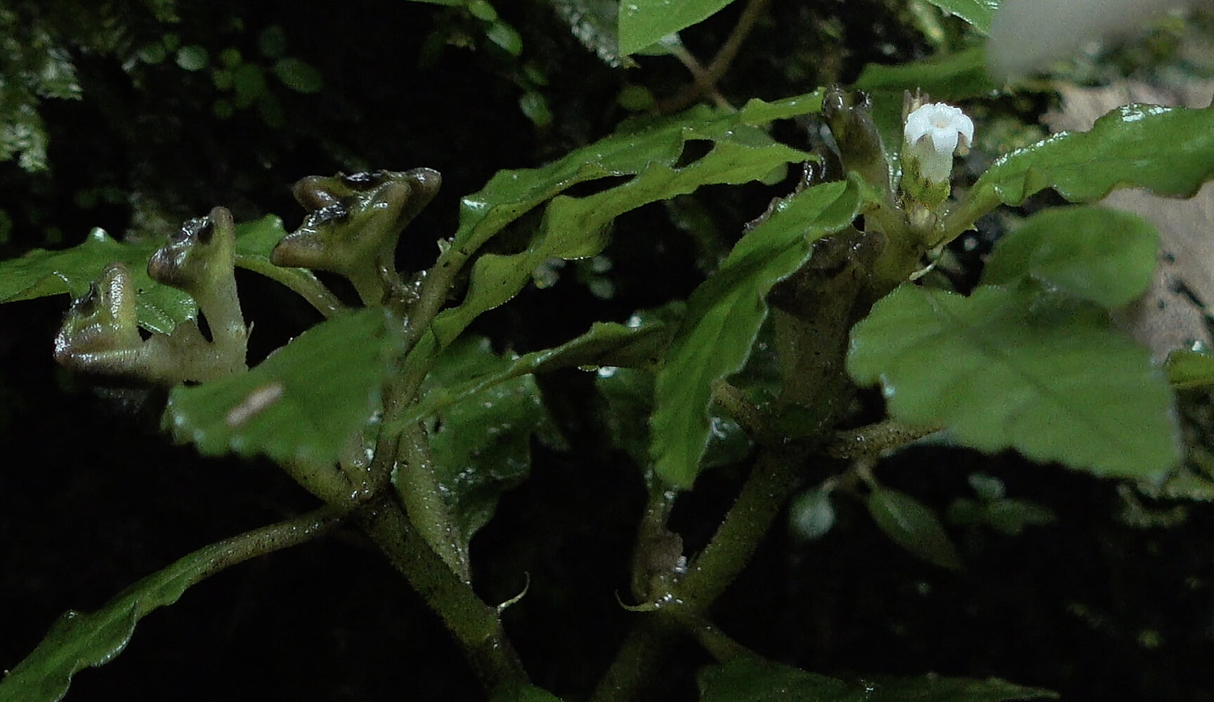 Ophiorrhiza crispa, flower and characteristic boat shaped upward opening rainsplash fleshy capsular fruits, Warsambin waterfall, Waigeo, Raja Ampat, Southwest Papua