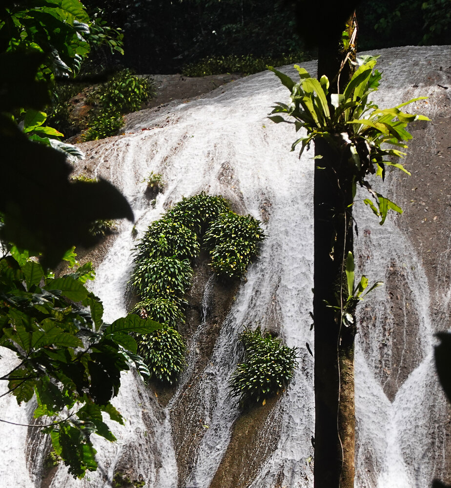Homalomena stollei and Thelypteris cataractorum in cracks of limestone slabs, War Inkabom Waterfall, Batanta, Southwest Papua