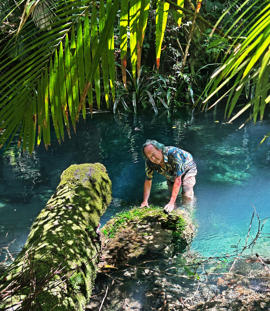 Patrick Blanc observing Leptochilus pteropus subsp. minor creeping on a submerged dead log, Waigeo, Papua, May 2025