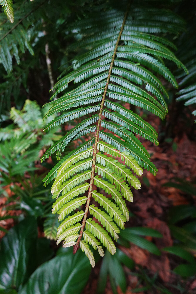 Phyllanthus mimosoides, lateral branched horizontal stem similar to a fern frond but exhibiting a new pale green apical growth, Petit Bras David, Basse Terre, Guadeloupe