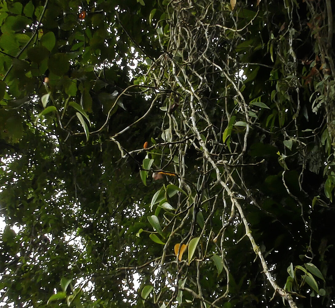 Scindapsus pictus, adult phase in forest canopy with much branched freely hanging stems and terminal erect infructescences, Danum Valley, Sabah, Borneo