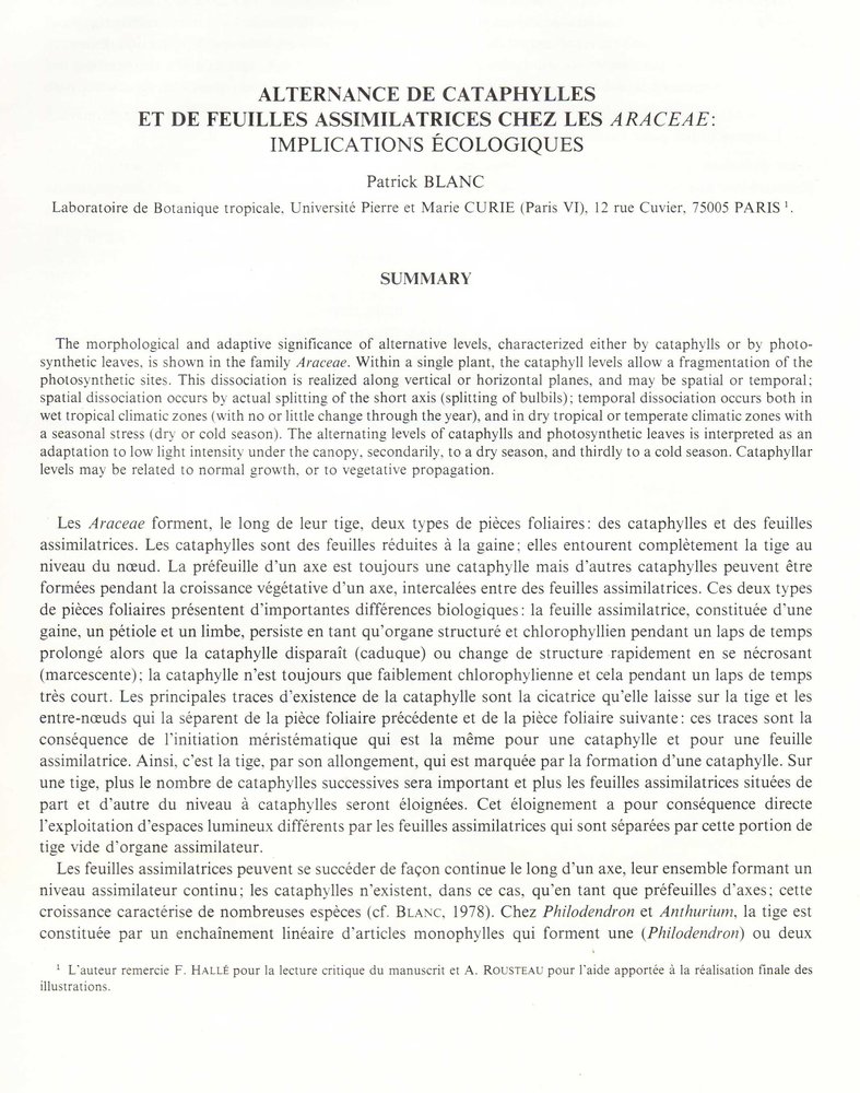 Blanc P., 1982, Alternance de cataphylles et de feuilles assimilatrices chez les Araceae, implications écologiques, Mem. Mus. nat. Hist. nat., 132, 263-272