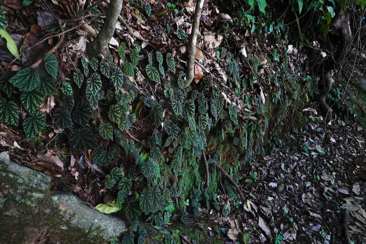 Begonia meyeri johannis, juvenile plant with brown leaves vertically climbing, Way to Lupanga peak, 1500 m asl, Uluguru Mts, Tanzania