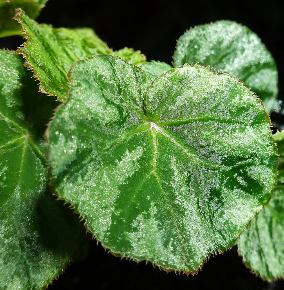 Begonia sp. nov., velvet sheen due to lines of dome shaped epidermal cells and refractive patches due to epidermal cells filled with gaz, Buntu Burake, Makale, South Sulawesi