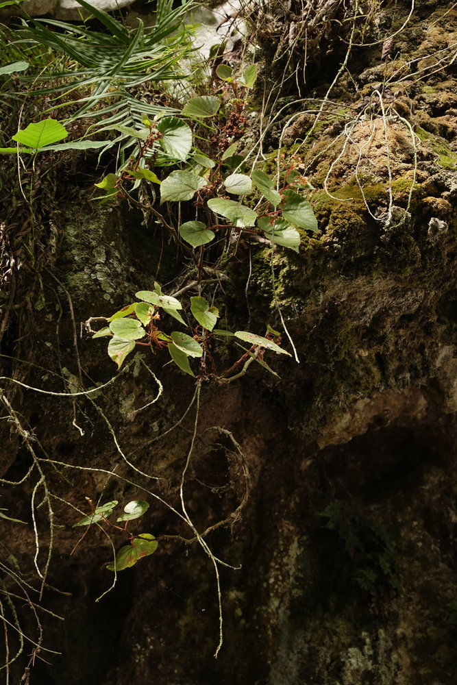 Begonia sp. nov., multistemmed individual emerging from a small hole in the vertical karst cluff, Buntu Burake, 1050 m asl, Makale, South Sulawesi