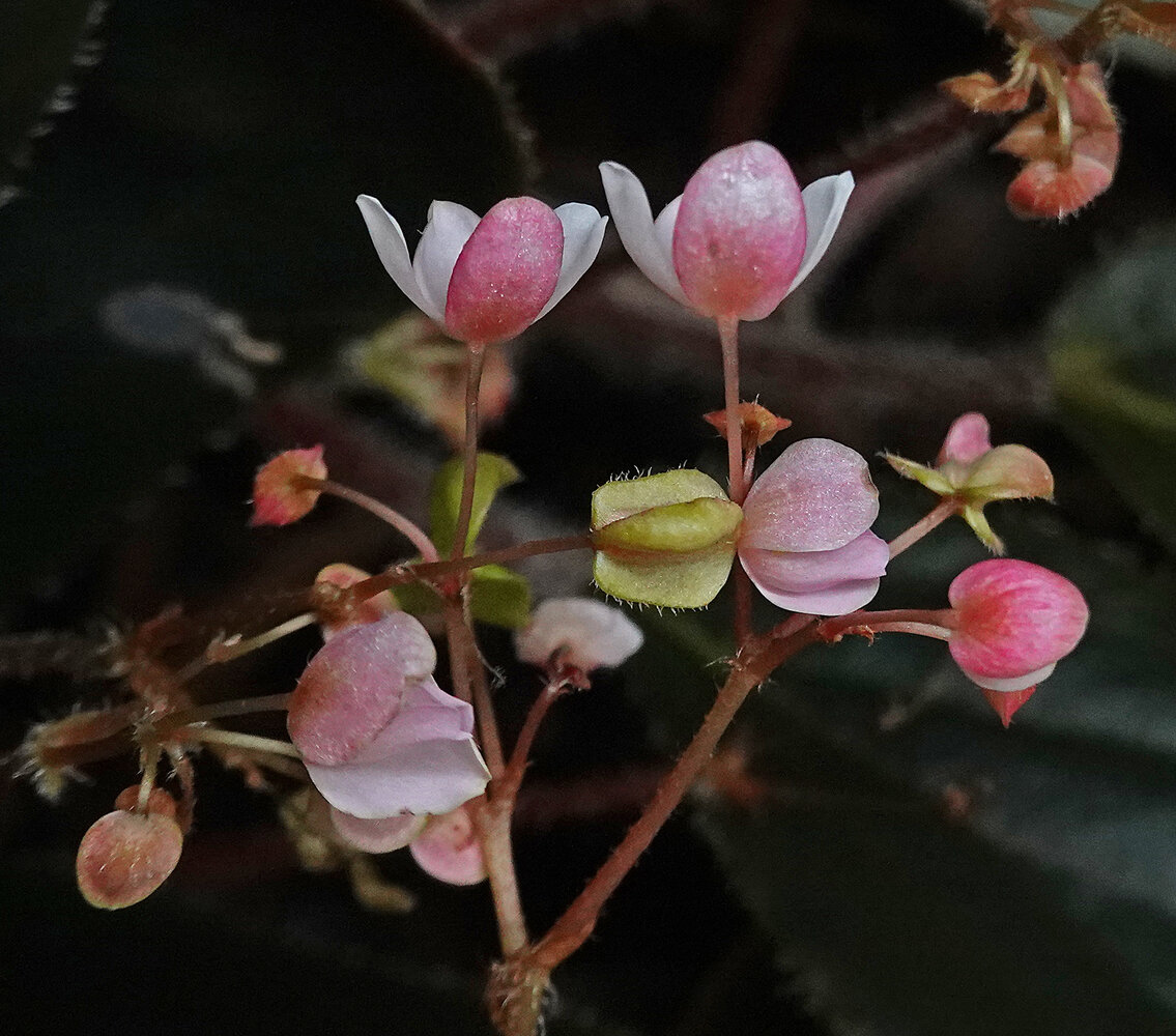 Begonia blancii, plain dark brown leaved form, male and female flowers with outer white tepals largely suffused with bright pink, Bulalakaw Falls, Palawan, Philippines