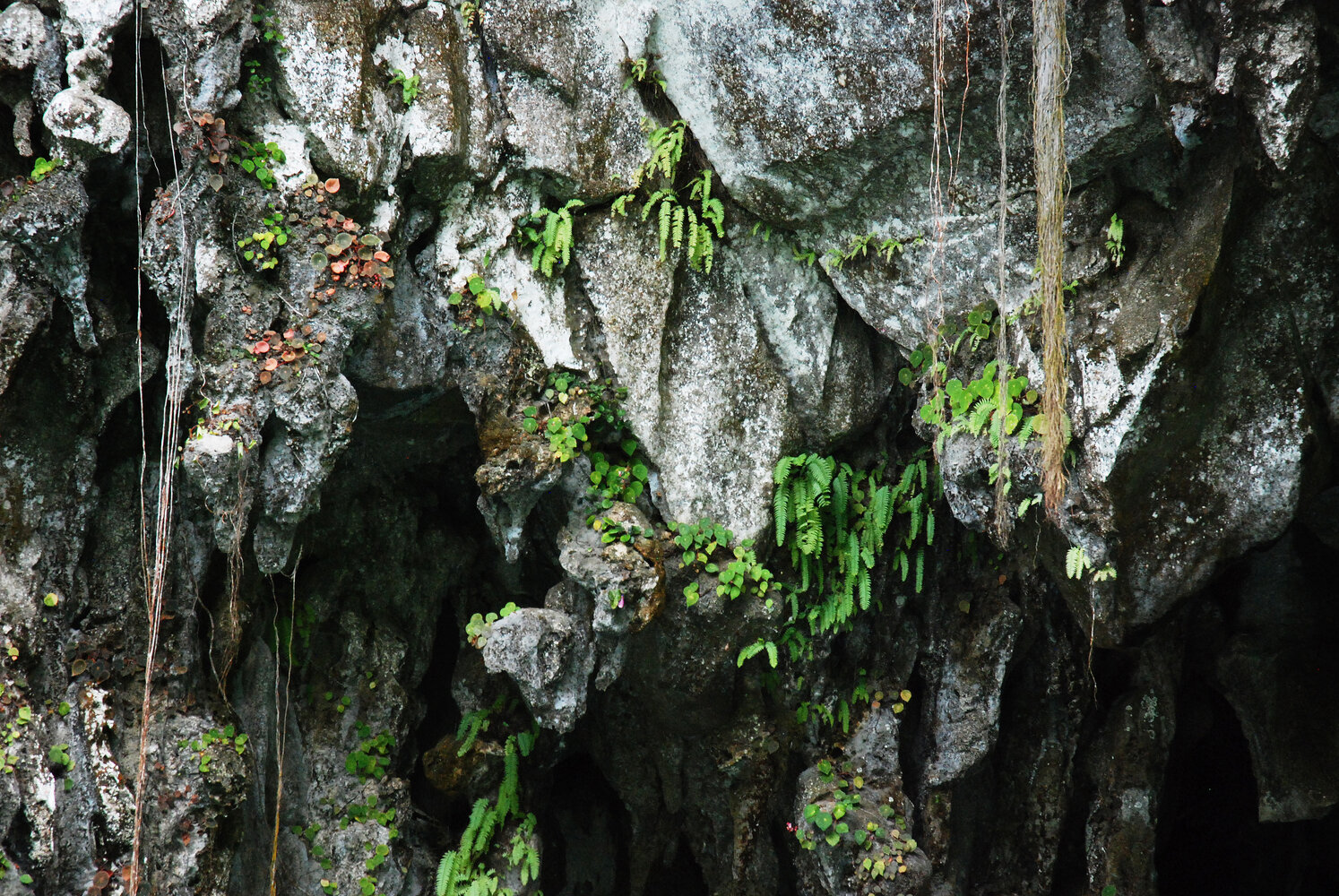 Begonia tabonensis and Alocasia culionensis on limestone cliff, Tabon Cave, Lipuun Point, Palawan, Philippines