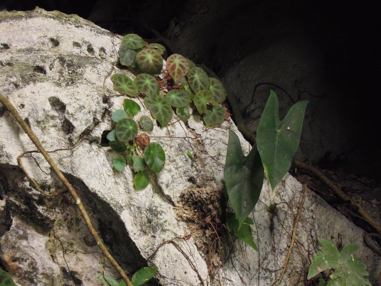 Begonia ignorata populatont, on limestone cliff at cave entrance, Lake Kenyir, Malaysia