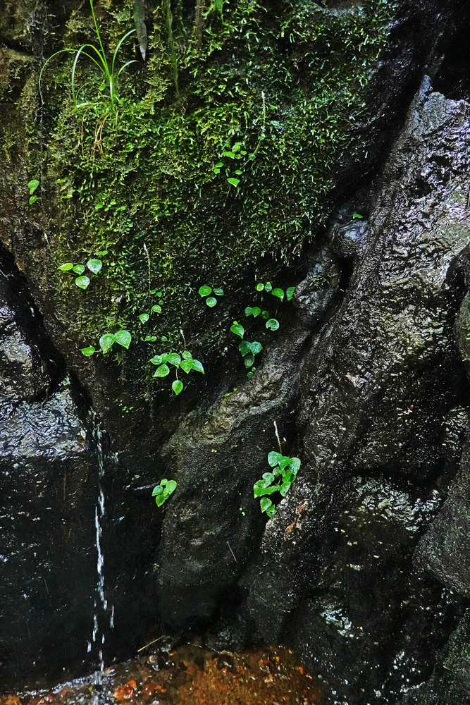 Peperomia pedicellata on mossy seeping rock in waterfall, Biotopo del Quetzal, Baja Verapaz, Guatemala