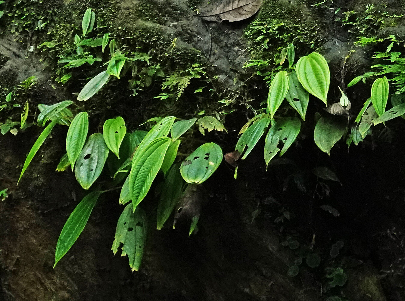 Peperomia petrophila in the same waterfall as Monolena elliptica and exhibiting a similar venation pattern and leaf texture, Mashpi FR, Pichincha, Ecuador
