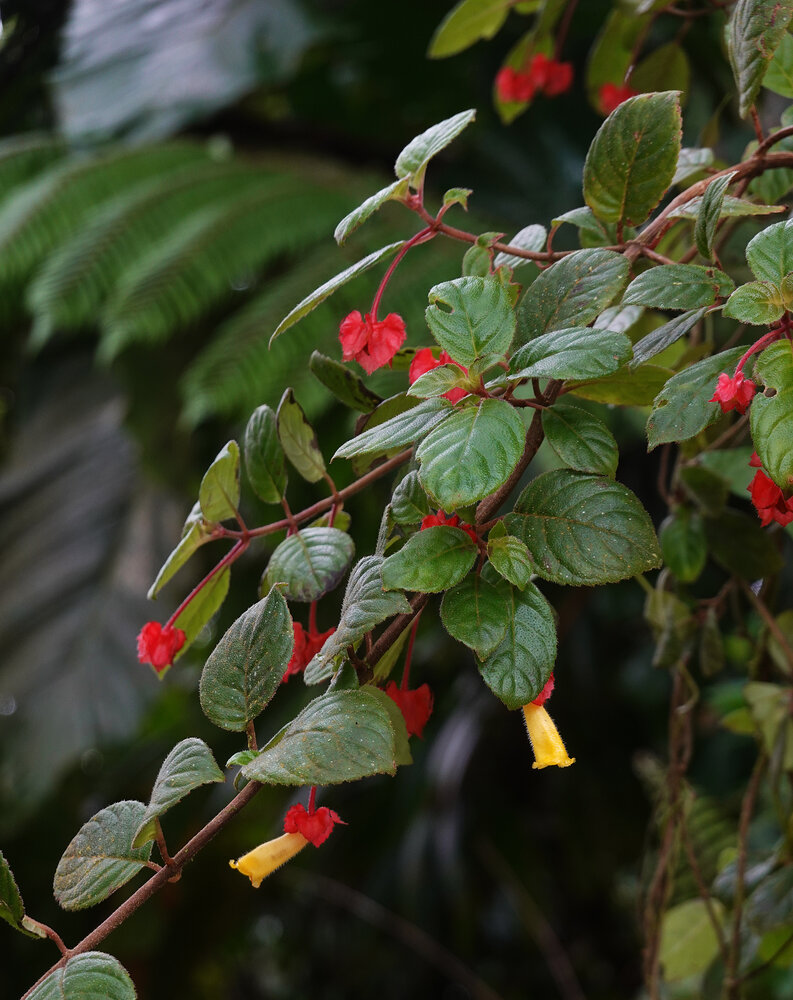 Medinilla alpestris,small individual with inflorescence and infructescence on tree fern stipe, Tjibodas BG, Java