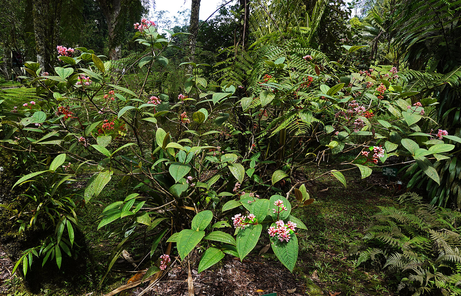 Medinilla alpestris, a much branched individual plant with inflorescences and infructescences, Tjibodas BG, Java