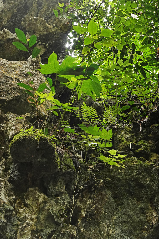 Tacca palmatifida on vertical mossy limestone boulder in forest understory, Tana Toraja, South Sulawesi