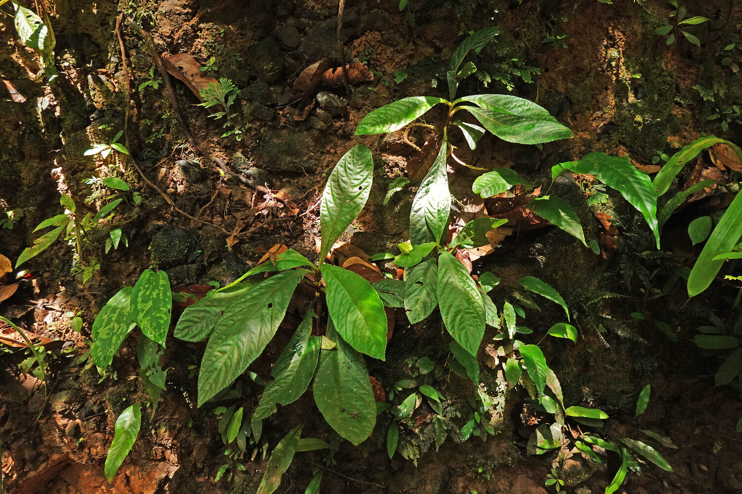 Cyrtandra sp., a plagiotropic anisophyllous species on a steep earth bank, bending above a forest stream, Deramakot FR, Sabah, Borneo