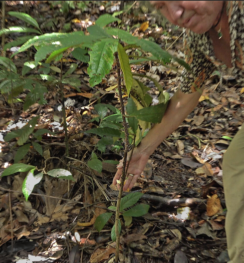 Patrick Blanc showing two small flowers along the lignified stem of a monocaulous cauliflorous Cyrtandra sp. sect. Centrosiphon, Malagufuk, Sorong, Papua, May 2025