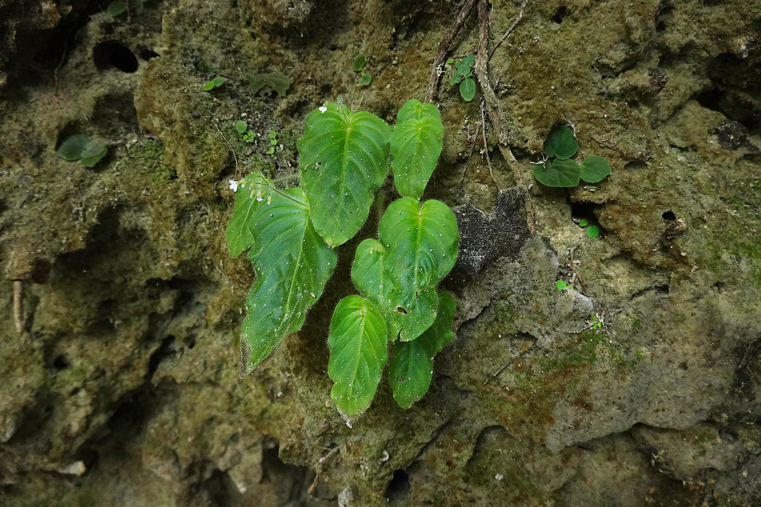 Begonia siccacaudata, disjunct individuals in horizontal cracks of a karst shaded cliff, Rammang Rammang, Maros, South Sulawesi