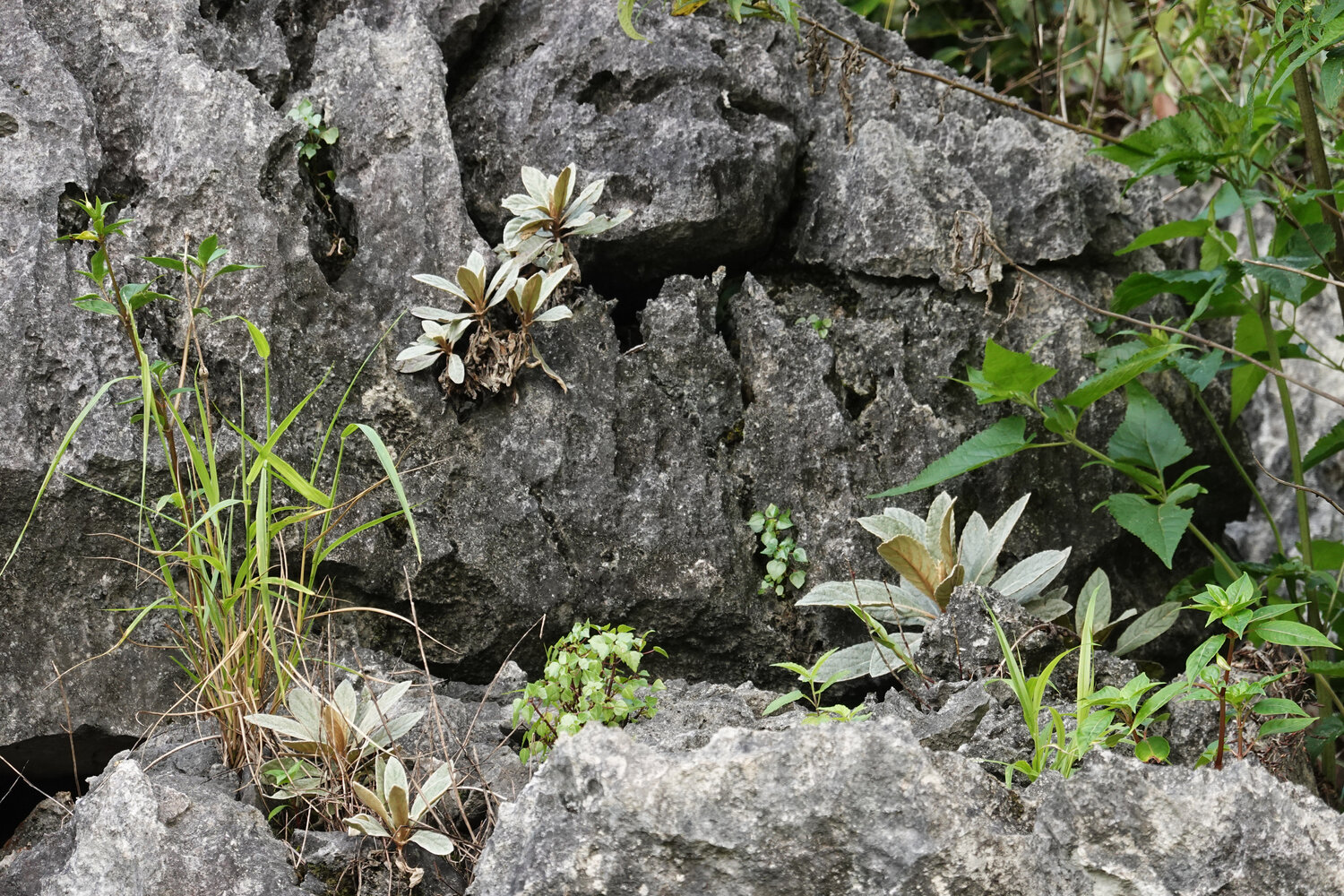 Paraboea cf. mataensis, almost cryptic on the vertical karst cliff due to the silvery white colour of the densely hairy leaves similar to the greyish white colour of the eroded rocks, Buntu Burake Makale, South Sulawesi