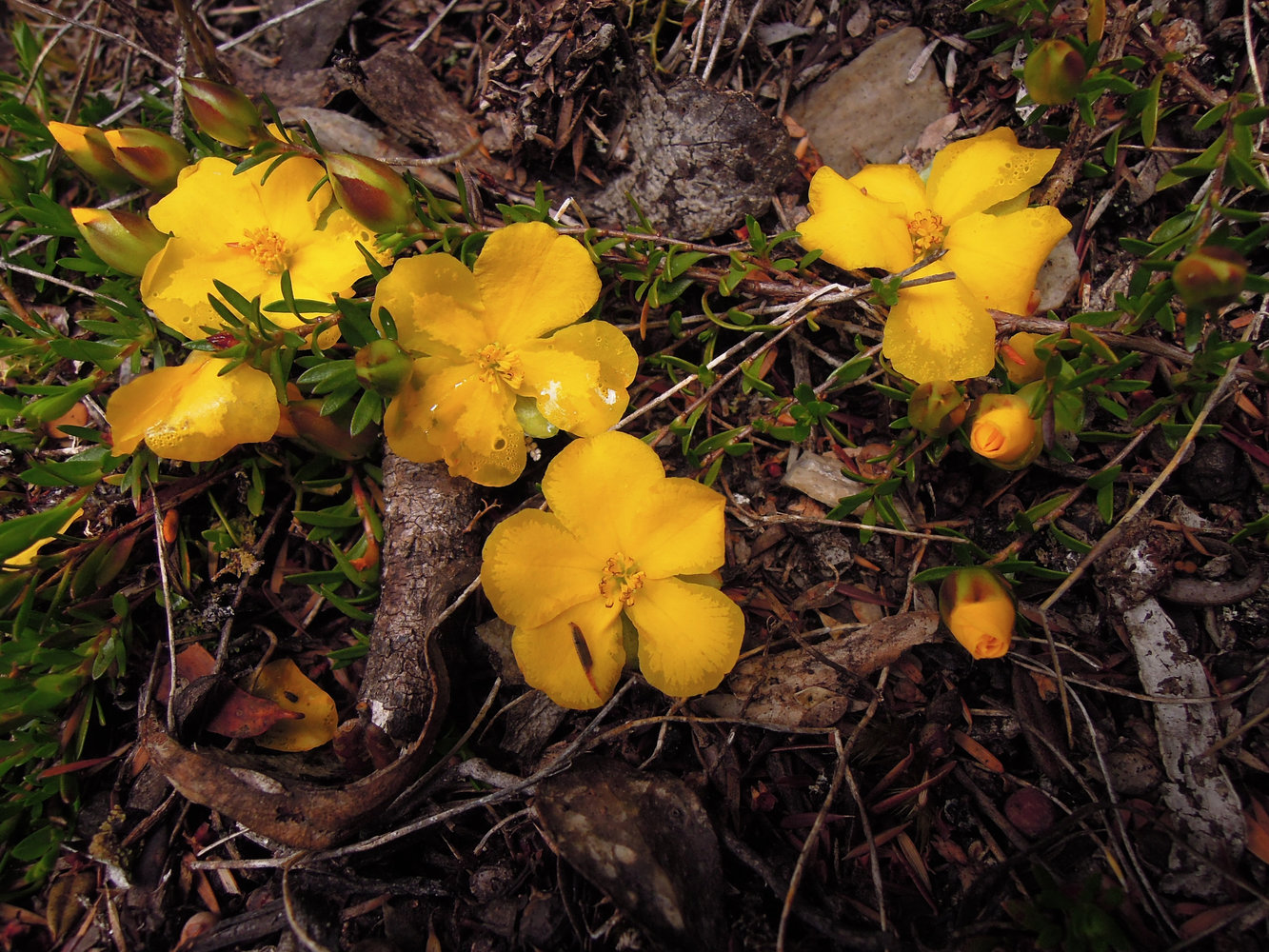 Hibbertia procumbens on a earth bank with huge flowers and tiny leaves, Cradle Mountain, Tasmania