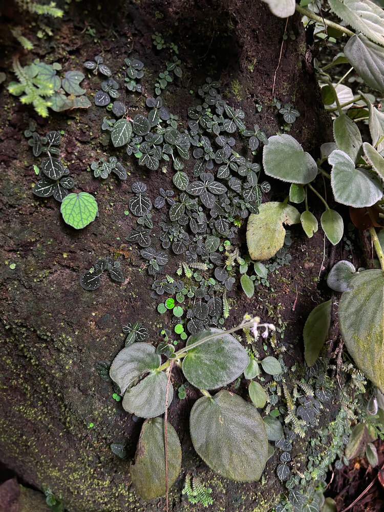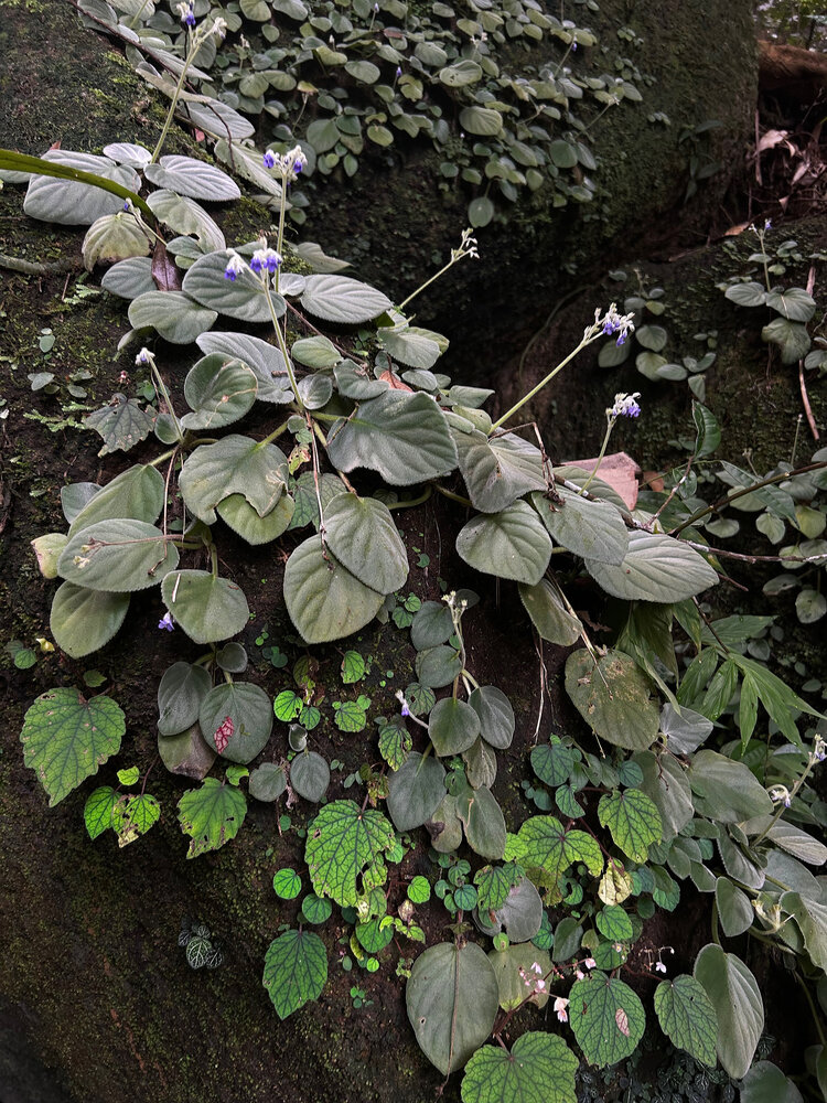 Loxocarpus incanus mixed with Begonia sinuata and a Rhaphidophora, Penang Hill, Malaysia.