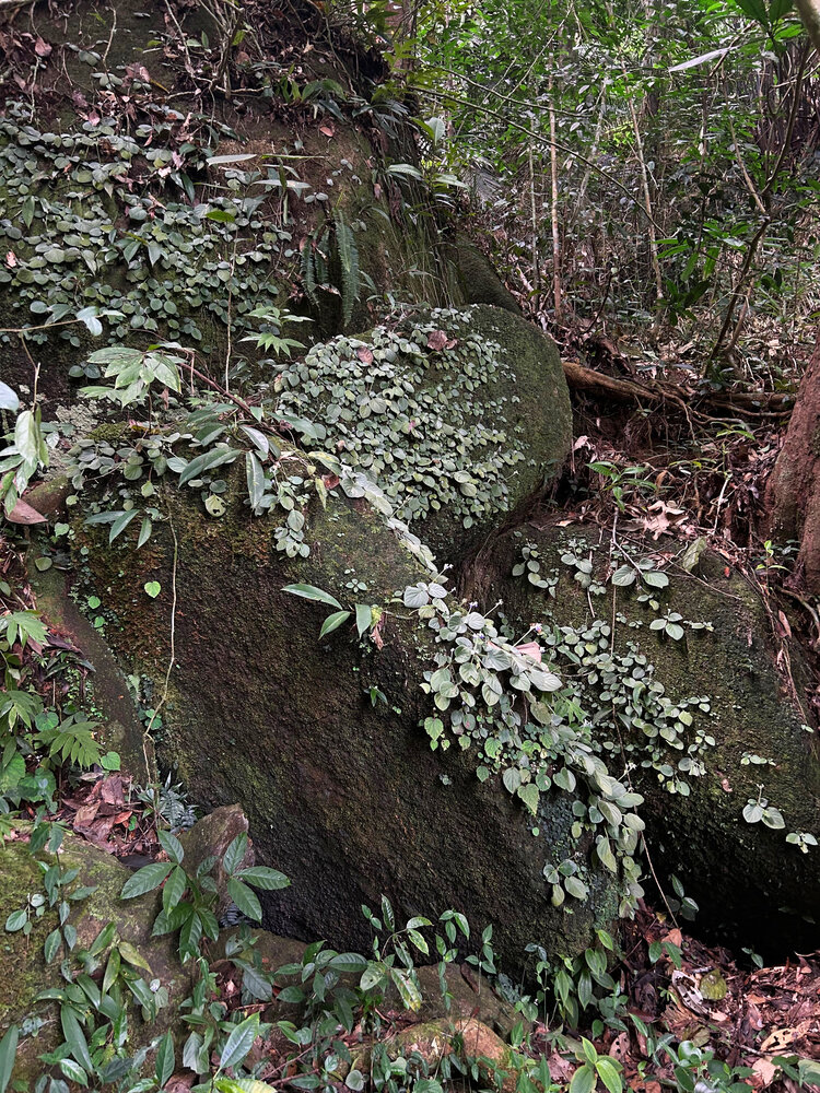 Loxocarpus incanus covering the bare rock faces of big boulders in a rocky chaos in forest understory, Penang Hill, Malaysia.