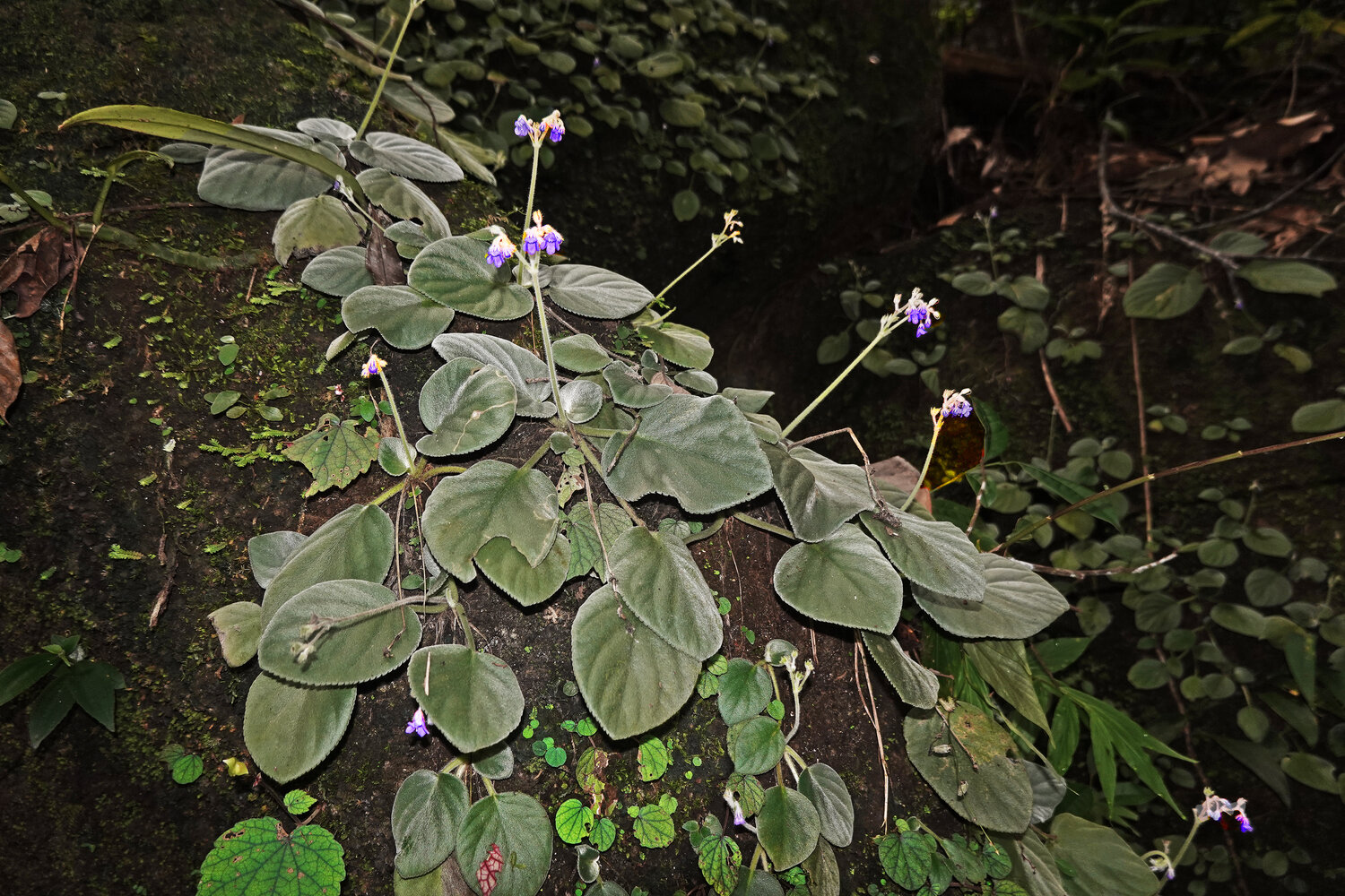 Loxocarpus incanus, very long appressed hairs giving a silky reflective appearence, this dense tomentum being a protection against dehydratation for these plants growing on vertical bare rocks, Penang Hill, Malaysia