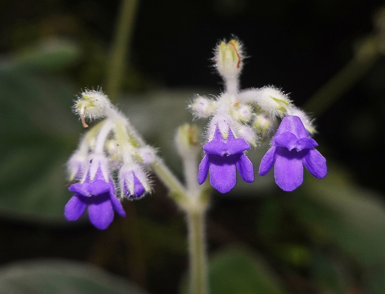 Loxocarpus incanus, flowers with glandular hairy calyx and peduncle and purple corolla, Penang Hill, Malaysia