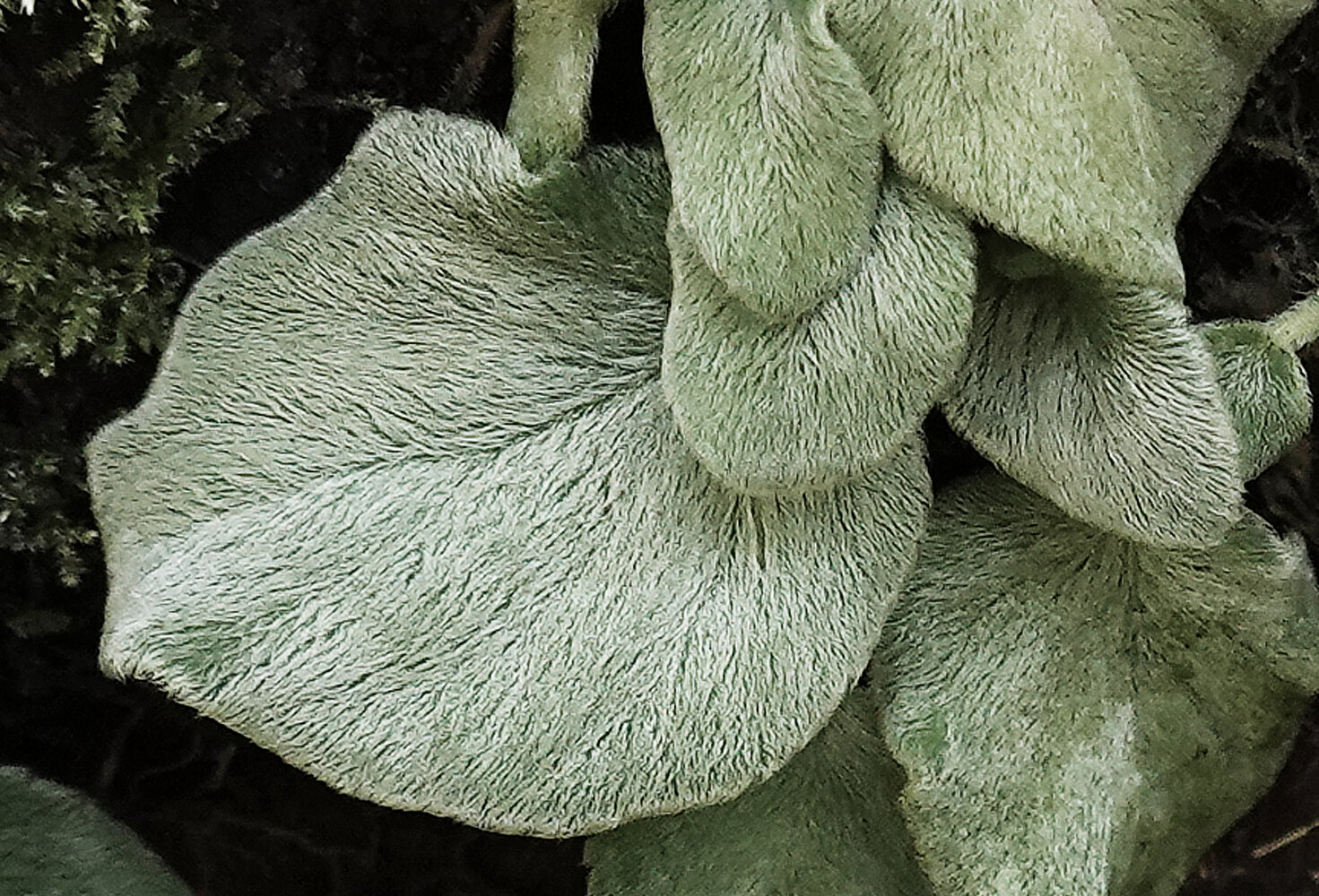 Ramonda myconi, the faintly straightened upper leaves of the rosette are fixing some plant fragments falling from canopy thus creating some basal humus, Andorra