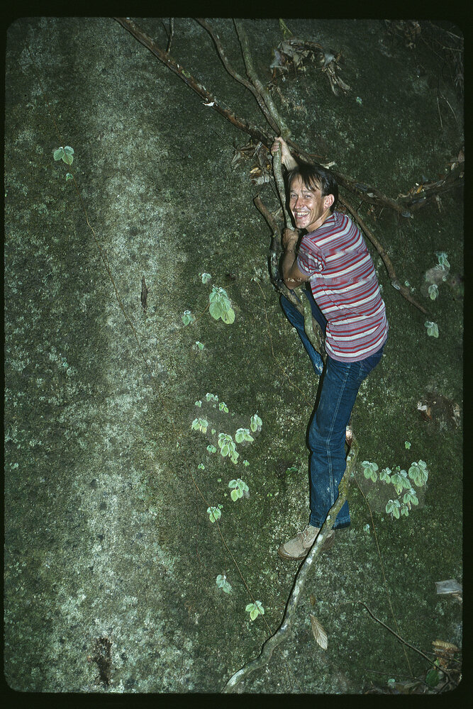 Patrick Blanc climbing on a vertical rock face to observe a population of Loxocarpus incanus, Penang Hill, Malaysia, Aug. 1984