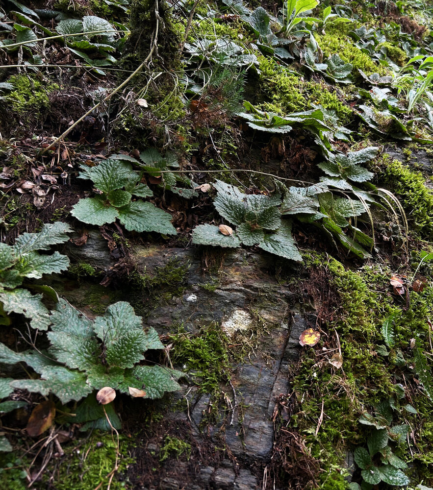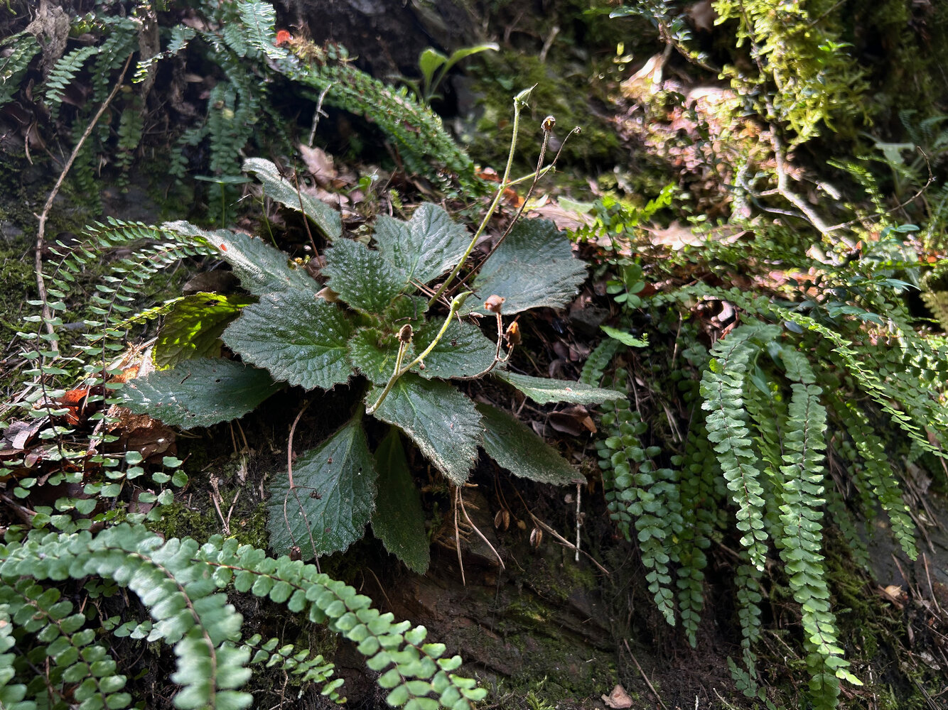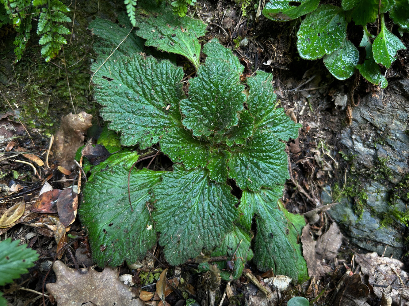 Ramonda myconi, bullate leaf structure, this three dimensional pattern increasing the photosynthetic leaf surface in this low light situation, Andorra