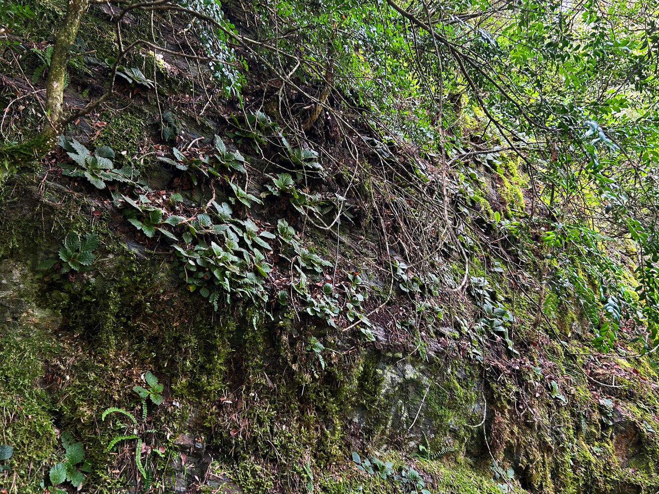 Ridleyandra cf. porphyrantha, seedlings and young plants at all stages on vertical earth rocky bank thus expressing a perfect regeneration, Kenyir Lake, Malaysia