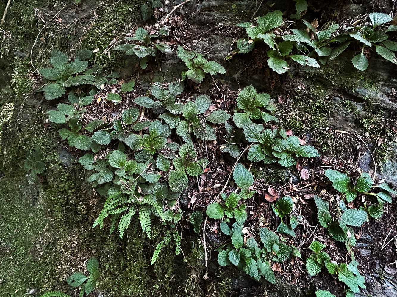 Patrick Blanc and a population of Ramonda myconi on vertical mossy shale rock faces, Pyrenees at 1200 m asl, Andorra, July 2025