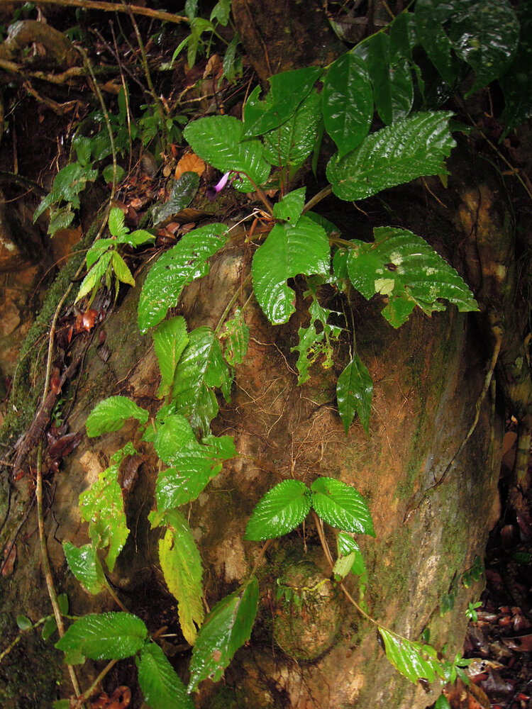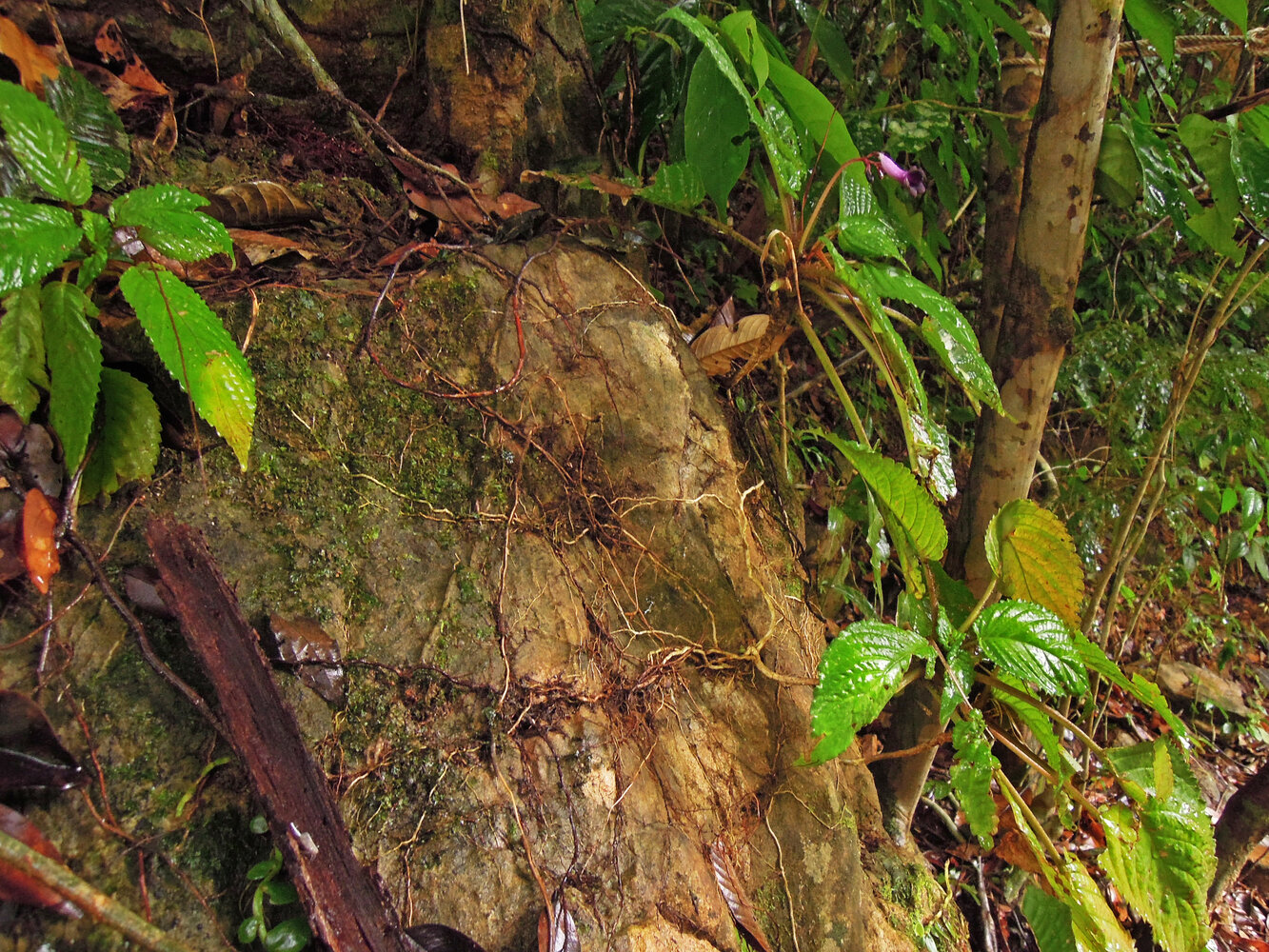 Ridleyandra cf. porphyrantha, adult plants with the root system superficially covering the vertical bare rock, Kenyir Lake, Malaysia