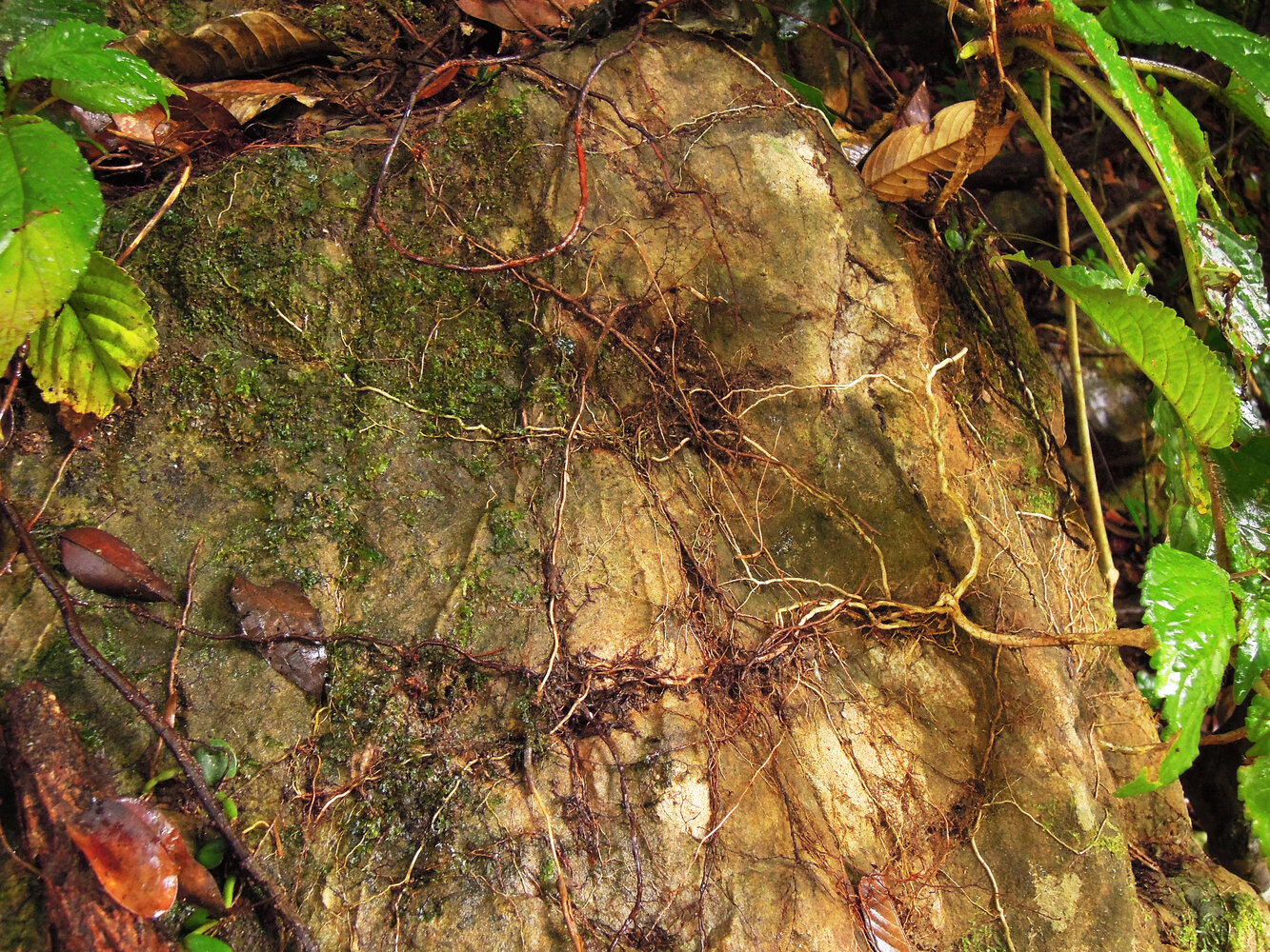 Ridleyandra cf. porphyrantha, roots covering the bare rock surface, Kenyir Lake, Malaysia