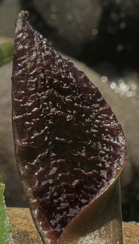 • Cryptocoryne cruddasiana, blackish limb of spatha with bulges in transverse ridges, close up, Malikha river, Putao, Kachin, Myanmar