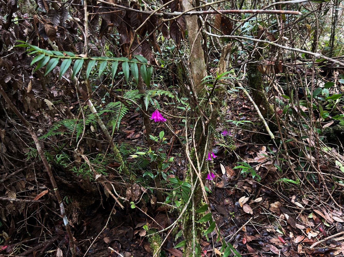 Patrick Blanc observing the small bright red tubular hanging flower of Rhododendron lindaueanum, Anggi Lakes, 2300 m asl, Arfak Mts, West Papua, May 2025