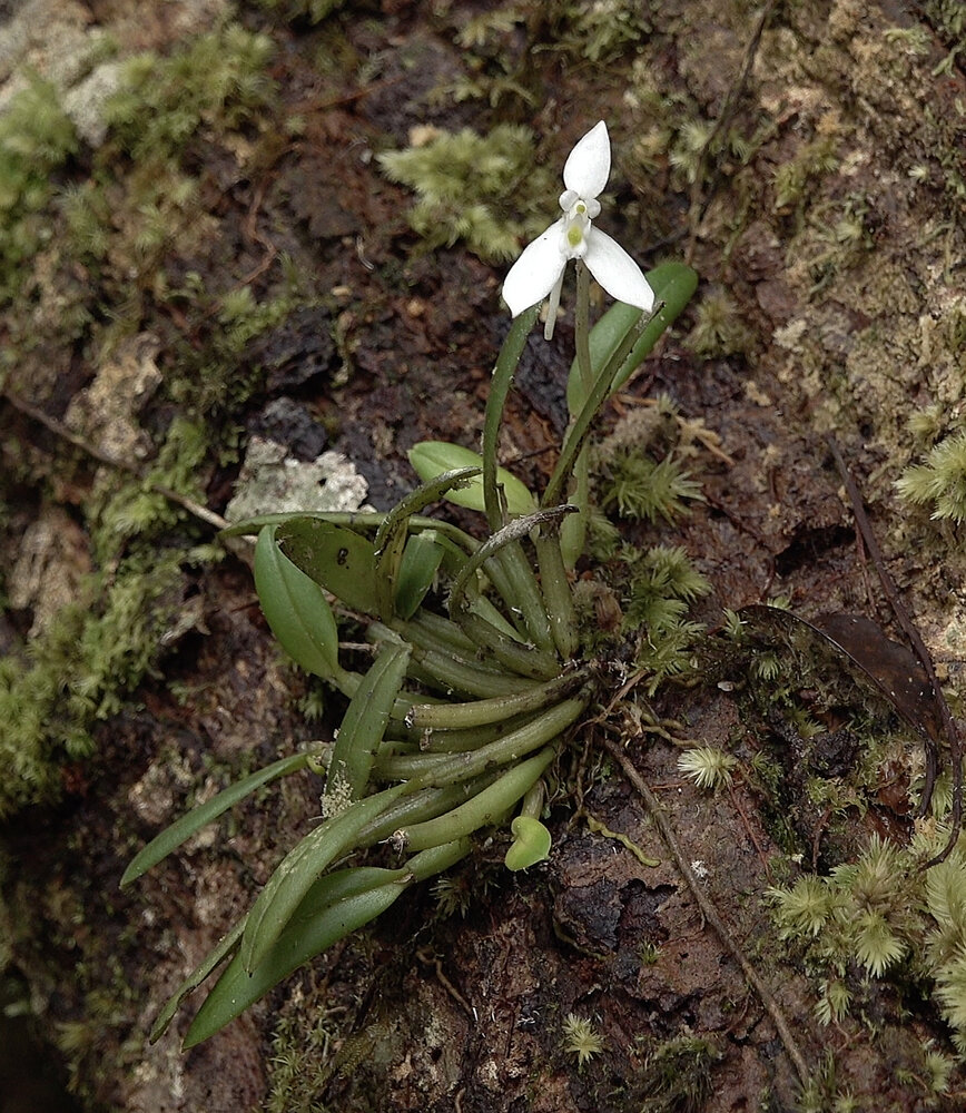 Mediocalcar pygmaeum, flower and branched stems, each sympodial unit with two foliage leaves, Anggi Lakes, 2300 m asl, Arfak Mts, West Papua
