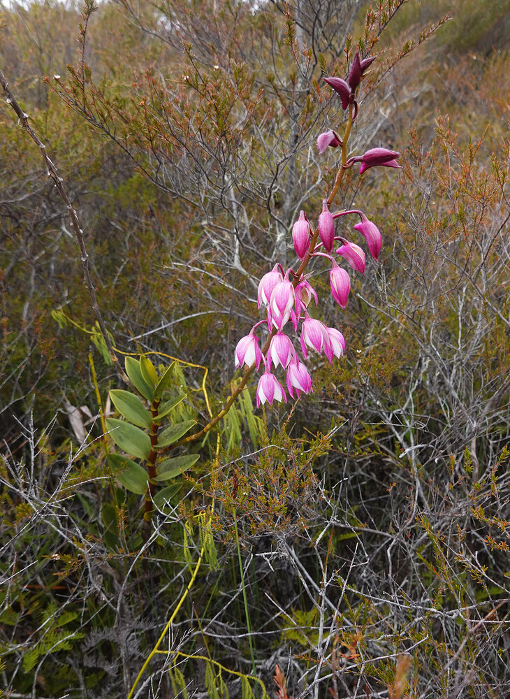 Dendrobium latipetalum in degraded upland savanna dominated by Baeckea frutescens, bracken ferns and Scaevola oppositiflia, Anggi Lakes, 2000 m asl, Arfak Mts, West Papua
