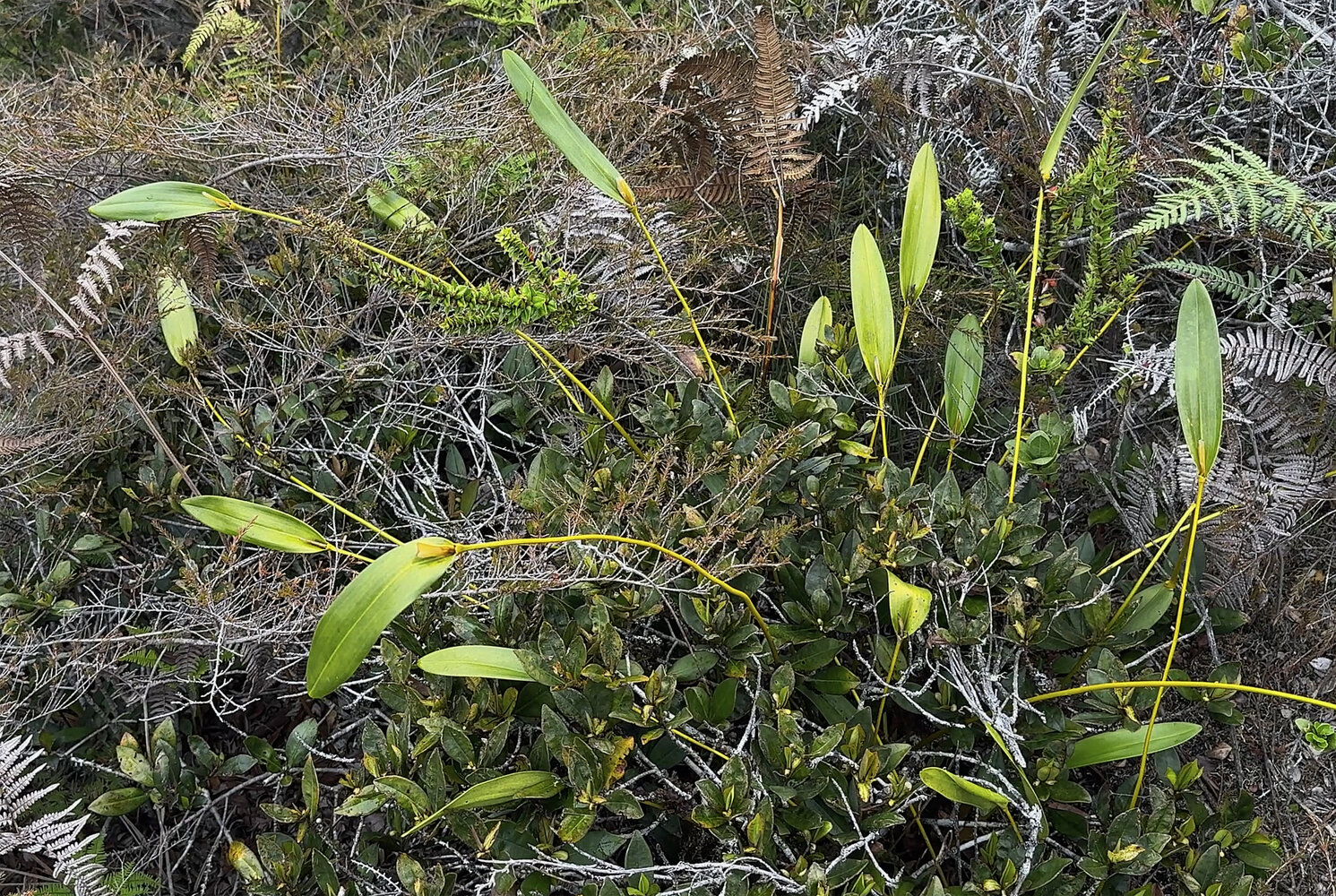 Dendrobium subclausum flowering on leafy stems in upland savanna, Anggi Lakes, 2300 m asl, Arfak Mts, West Papua