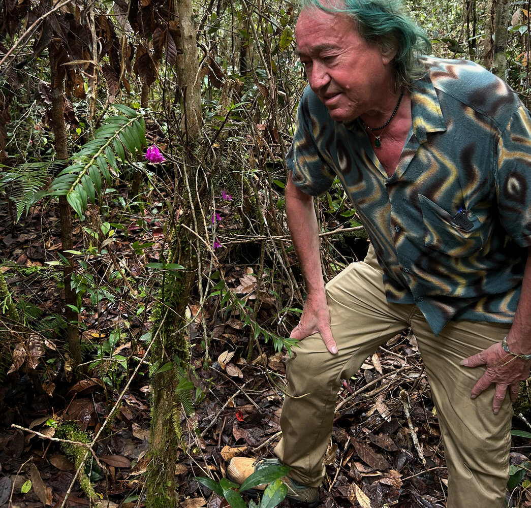 Patrick Blanc showing the flower of Dendrobium fluctuosum with long curved spur, Kwau, Arfak Mts, 1600 m asl, West Papua, May 2025