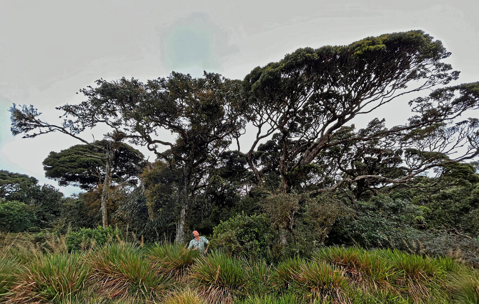 Patrick Blanc at forest edge behind clumps of Garnotia exaristata, Horton Plains, Sri Lanka, Nov. 2024