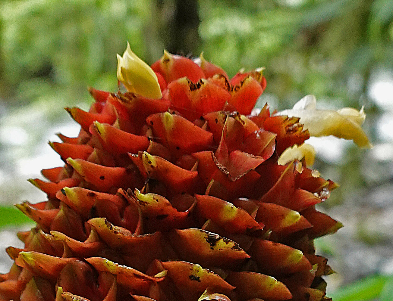 Tapeinochilos cf. salomonensis, decaying inflorescence with reddish brown bracts, some new flowers still attearing at the top, Tenaru Falls, Guadalcanal, Solomon Islands
