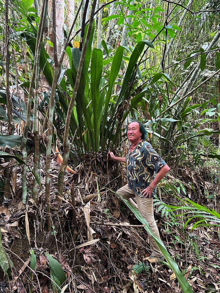 Patrick Blanc under a huge Monocot, either an Orchidantha or, more probably, a Tupistra, Lata Bunta, Bentong, Malaysia, Sept. 2025