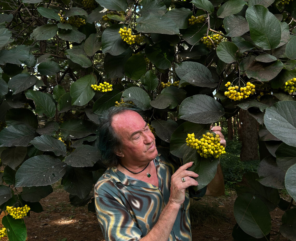 Patrick Blanc much intrigued by the bright yellow fruits of Ehretia dicksonii, Koishikawa Botanical Gardens, Tokyo, Oct. 2025