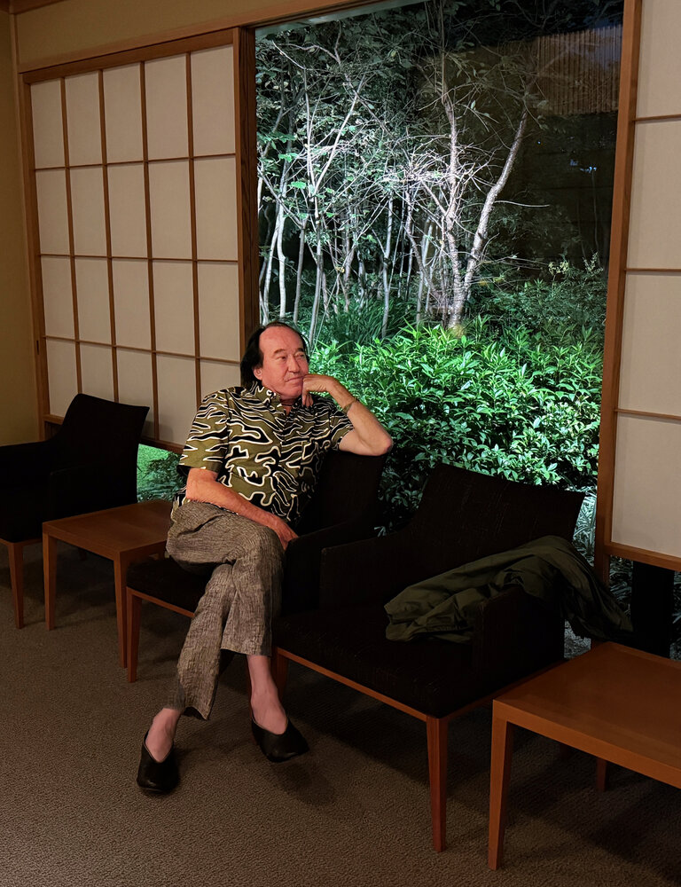 Patrick Blanc in front a dense clump of Sarcandra glabra, a native species traditionnally planted in the shade gardens , Tokyo, Oct. 2025