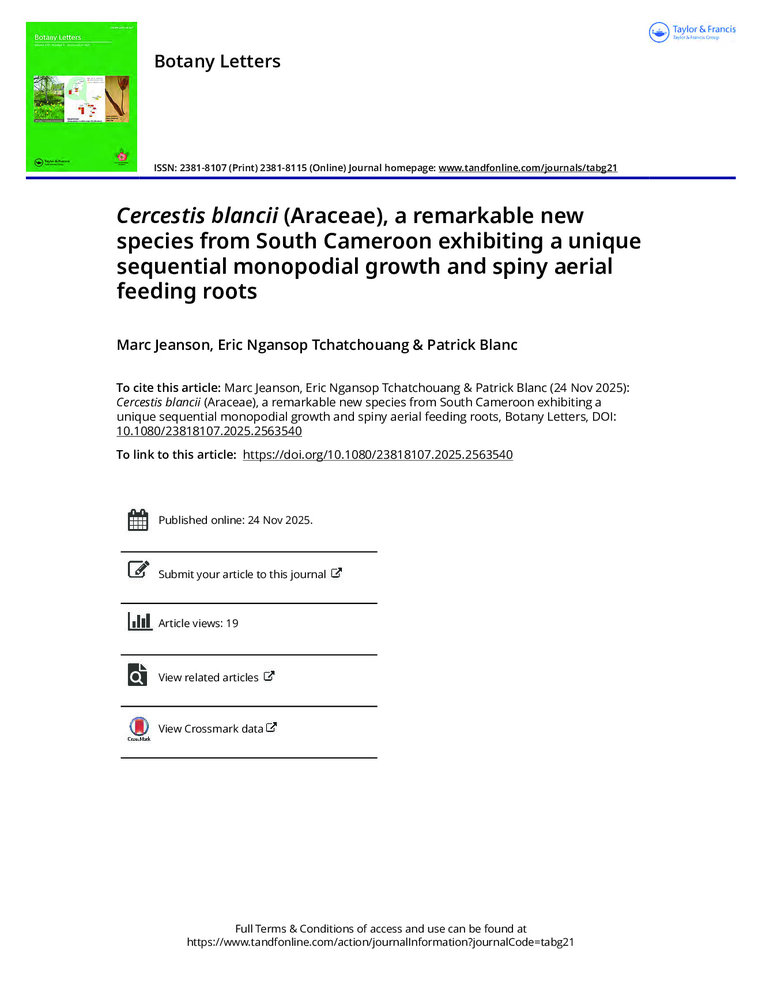 Jeanson M;, Ngansop, E., Blanc P., 2025, Cercestis blancii (Araceae), a remarkable new species from South Cameroon exhibiting a unique sequential monopodial growth and spiny aerial feeding roots.pdf