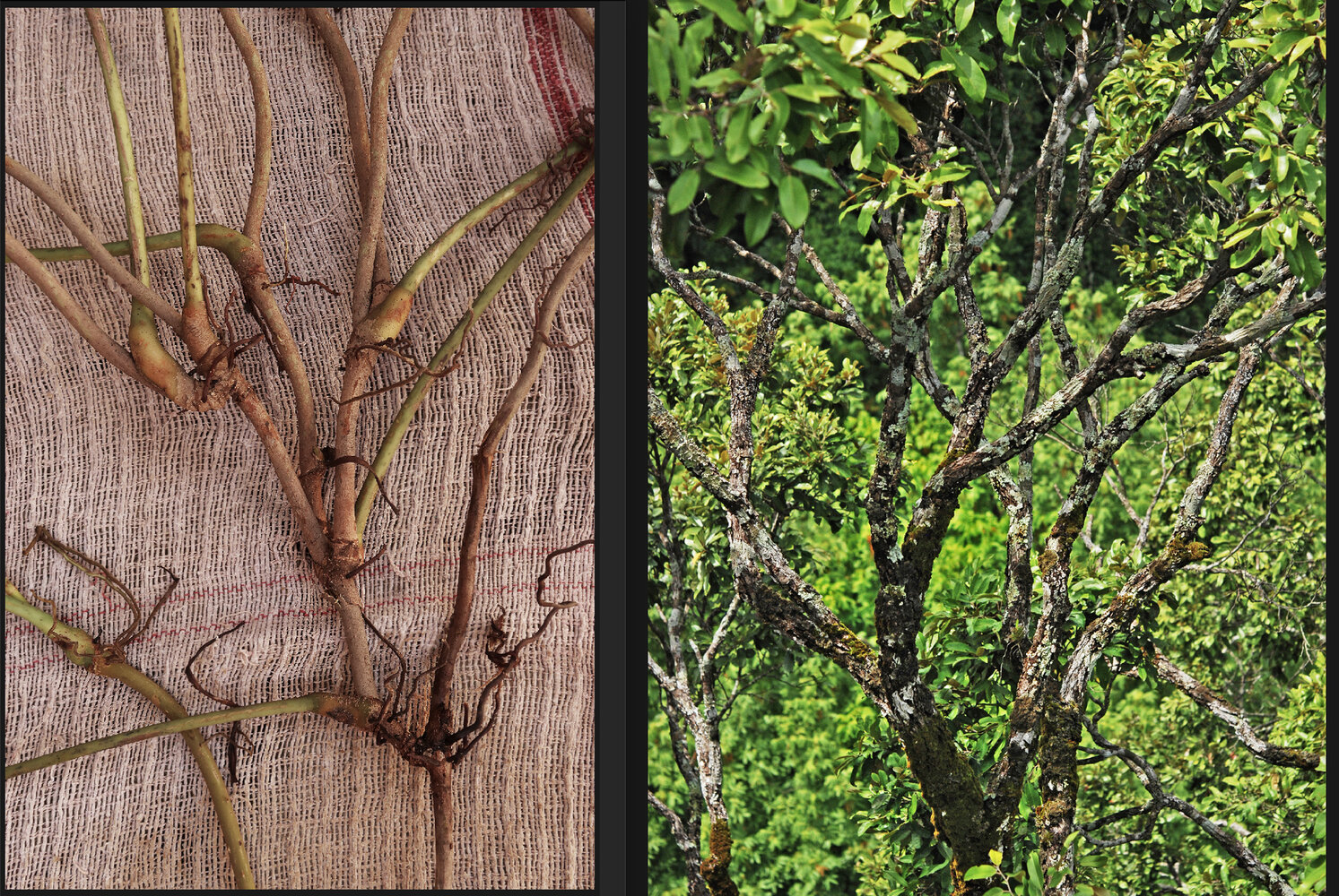 Cercestis blancii, an herbaceous Monocot climber and Dipterocarpus sp., a tree reaching forest canopy, both exhibiting similar bifurcating branching pattern and architecture due to recurrent traumatisms