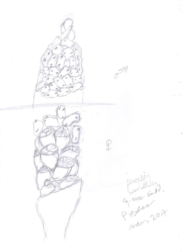 Cercestis blancii, a sketch of spadix by Patrick Blanc when he thought to barbelatus as the species name due to the barbed wire like spiny aerial feeding roots