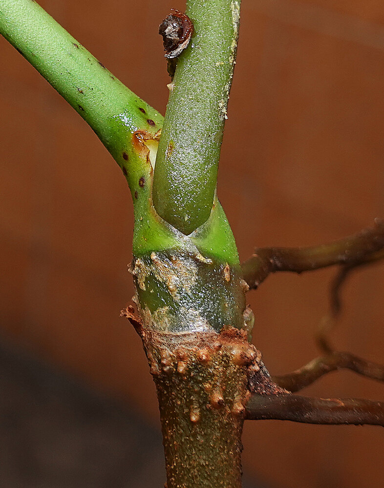 Cercestis blancii, stem embracing sheathing leaf base, induration of the geniculum due to multiple corky epidermal cell layers, Nkol Elon, Campo, Cameroon