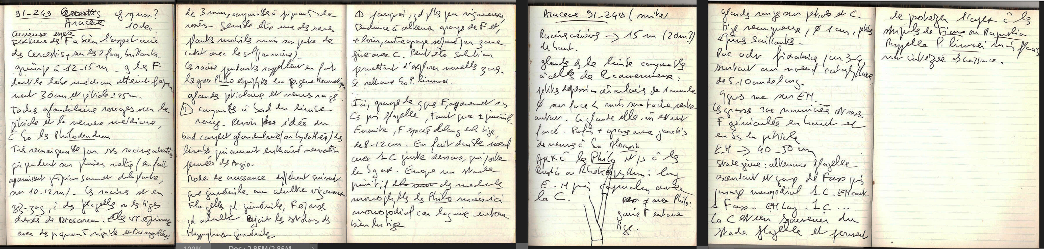 Field note book by Patrick Blanc on 10th Dec. 1991, explaining the growth habits of his newly discovered Cercestis sp. 91-249 finally named Cercestis blancii, in 2025, Ebodje, Campo, Cameroon