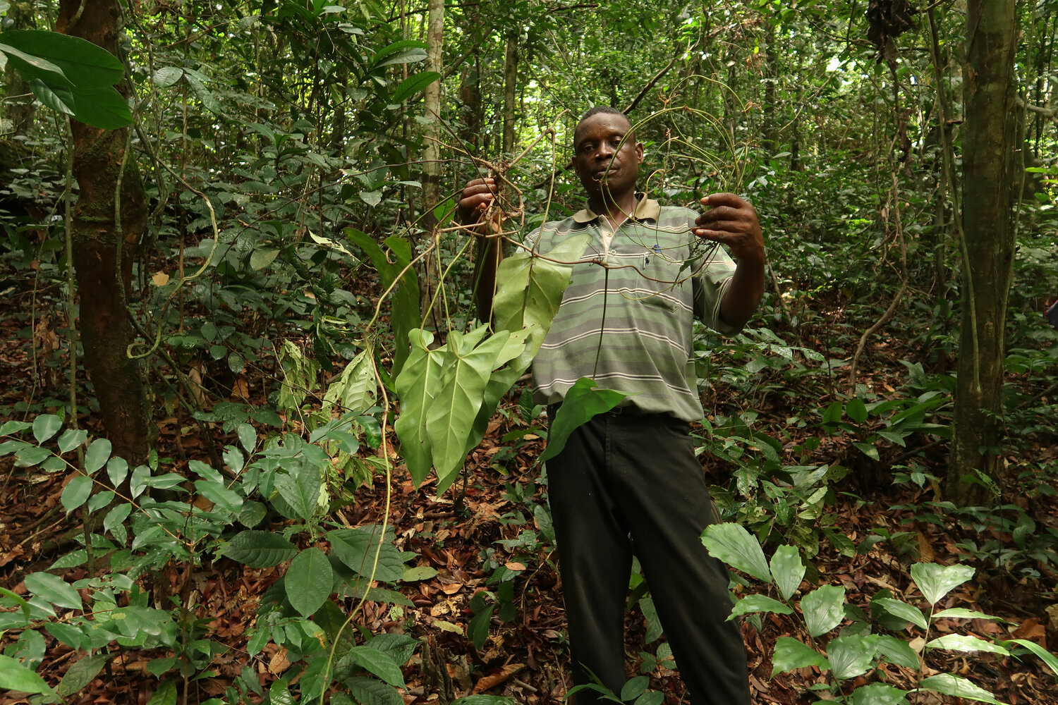 Innocent Medjo holding the terminal flagellum of a leafy stem of Cercestis blancii, Ebodjé, Cameroon